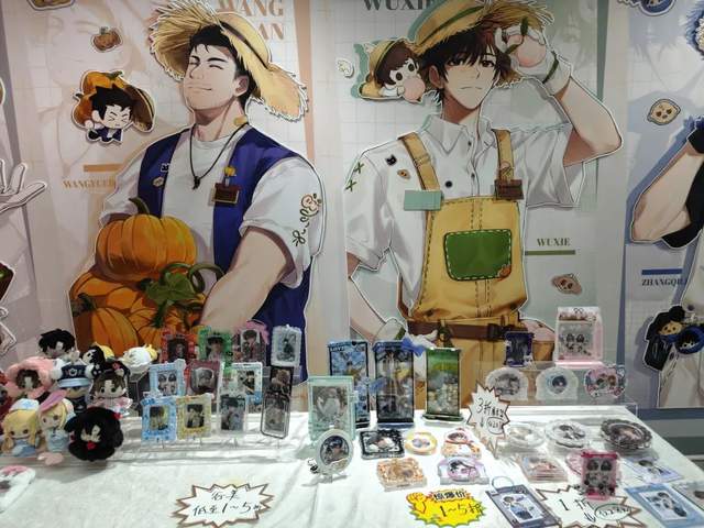 气球暖暖星快闪店门口是彩绘背景墙和二次元产品展陈,本次的主题系列为“果农”,《盗墓笔记》五大主要人物都化身为“果农”,色彩鲜艳,各具特色,不少粉丝也专门赶来合影留念。气球暖暖星快闪店相关负责人介绍说,“果农”系列是气球暖暖星根据原著的内容请专业画师专门设计创作,其造型和创意得到了版权方的认可,由此产生的一系列的人偶、吧唧、立牌等“谷子”产品和“谷美”产品(装饰和美化“谷子”的产品)很受粉丝欢迎。